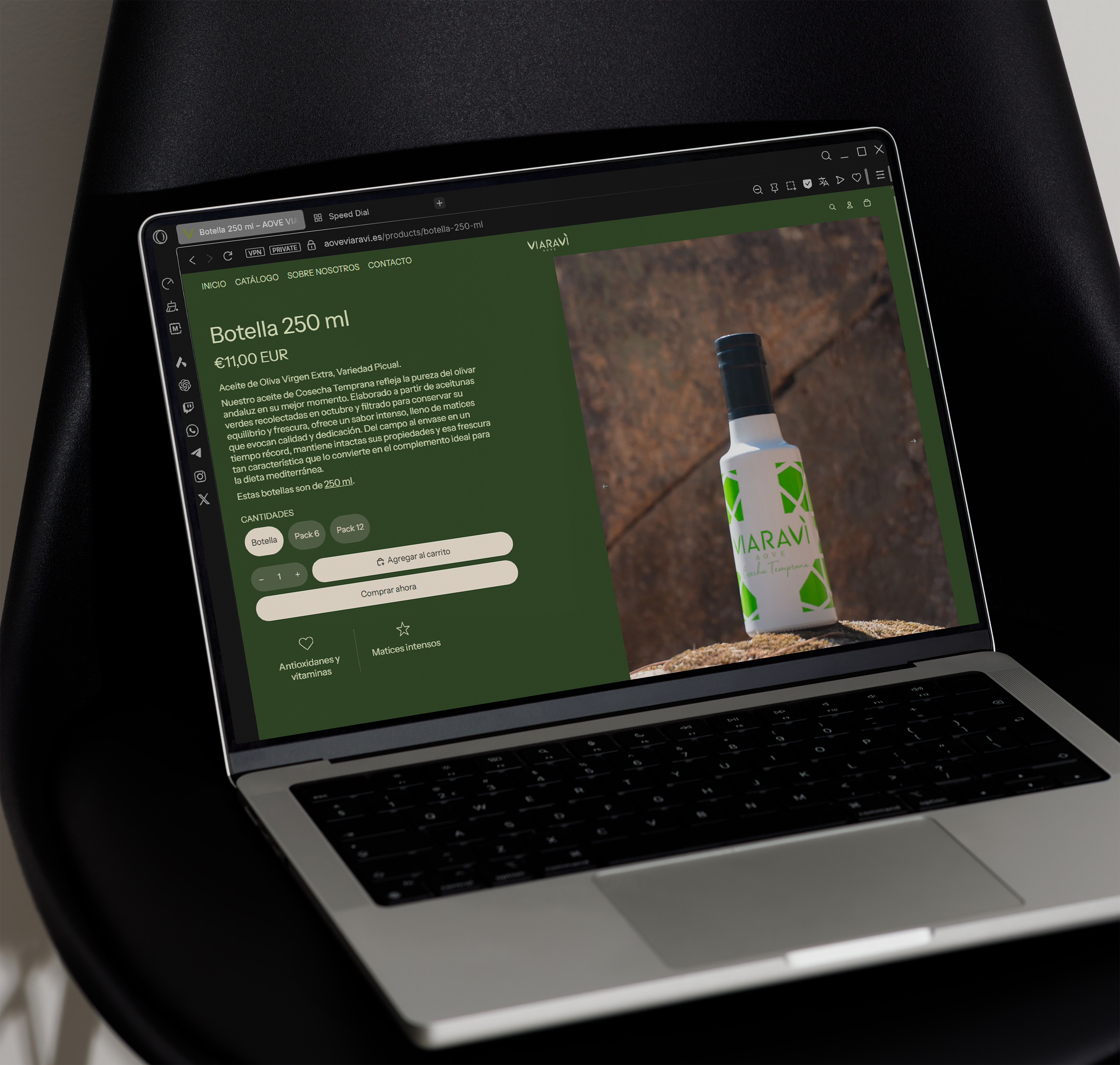 Since I had previously worked on Viaraví’s visual identity and packaging, the objective in this stage was not to reinvent the brand but to expand it in a coherent and meaningful way. The foundation was already solid, with a narrative deeply rooted in family heritage, land and tradition. My role here was to ensure that this identity remained consistent across new formats such as the commercial dossier and the website, developing a system that felt natural and connected to what already existed.